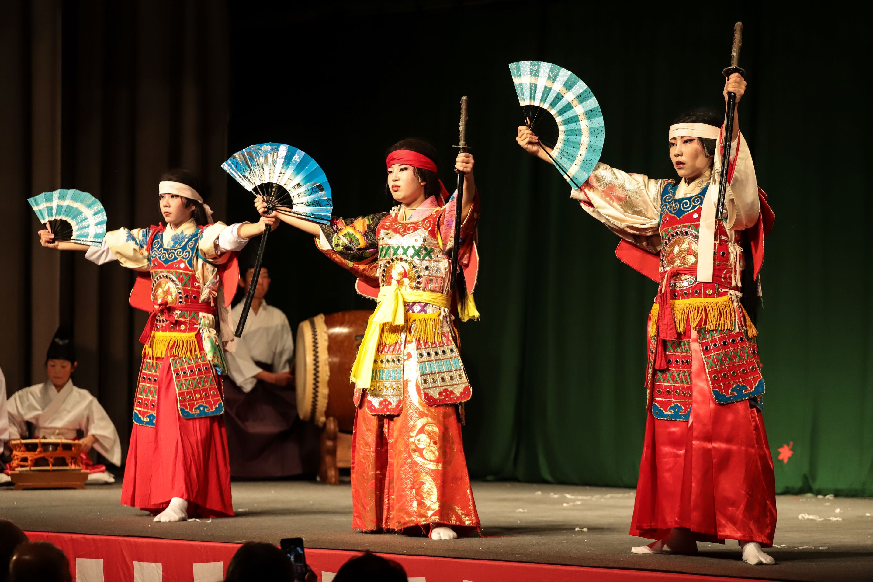 大太鼓:寺田皓太郎(こたろう)さん(高3)、小太鼓:河田壮翔(あきと)さん(大人)、手拍子:宮内侑希さん(大人)、笛:西迫星奈(せいな)さん(高3)。