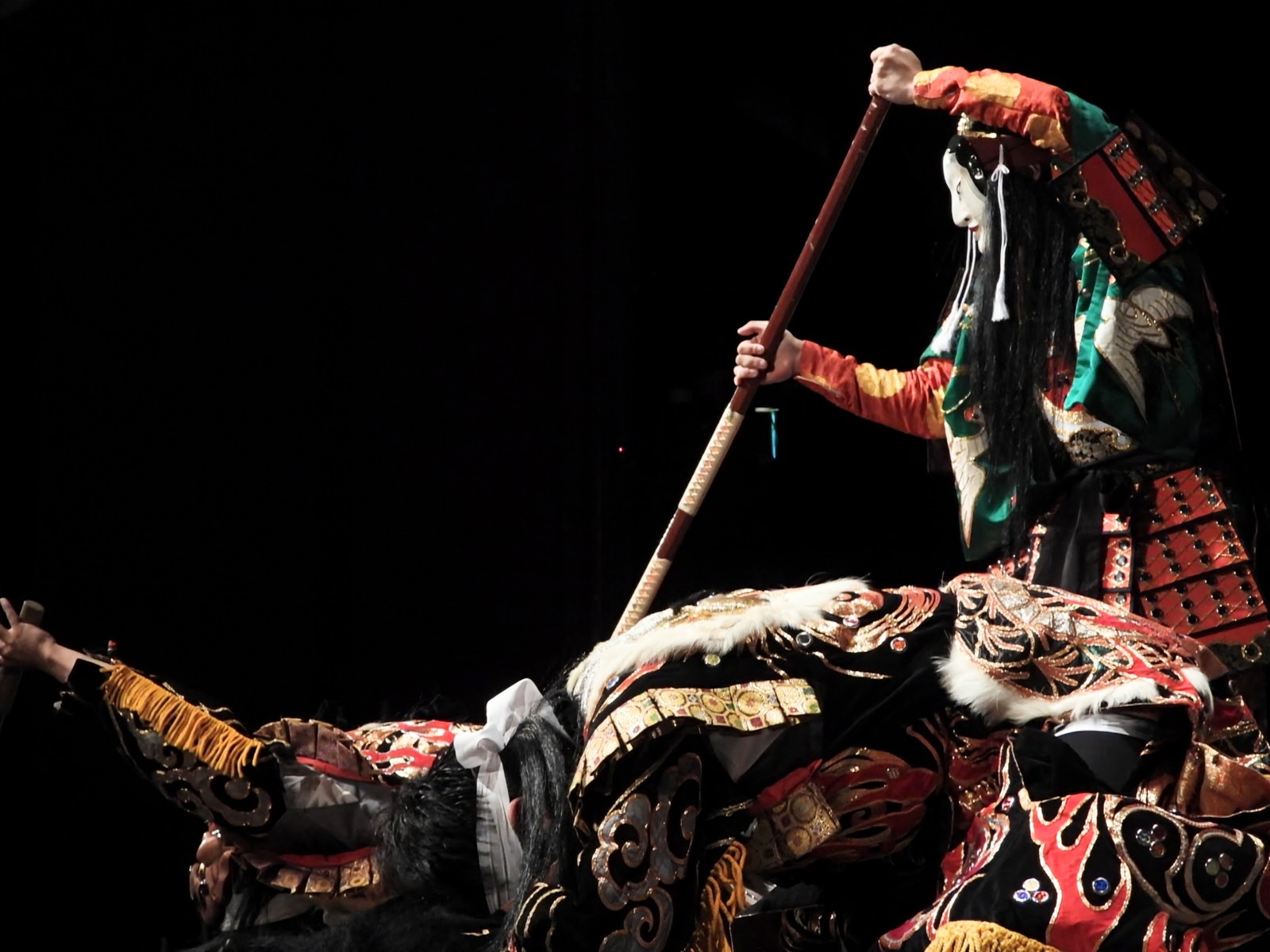 彦羽根の面は般若面というよく用いられる面ですが、口が動く般若面は非常に珍しく、舞の中でどんな表情を見せるか注目してください》